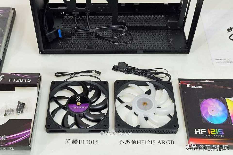 说到散热,这款ITX机箱可以装上3把风扇,其中顶置2个直径12cm的薄型风扇、下方1个直径9cm的薄型风扇。如下图,左边是闪麟自家的F12015,右边是我准备实装的乔思伯HF1215ARGB,我选择了带灯的风扇,也就意味着要多接几根连接线。