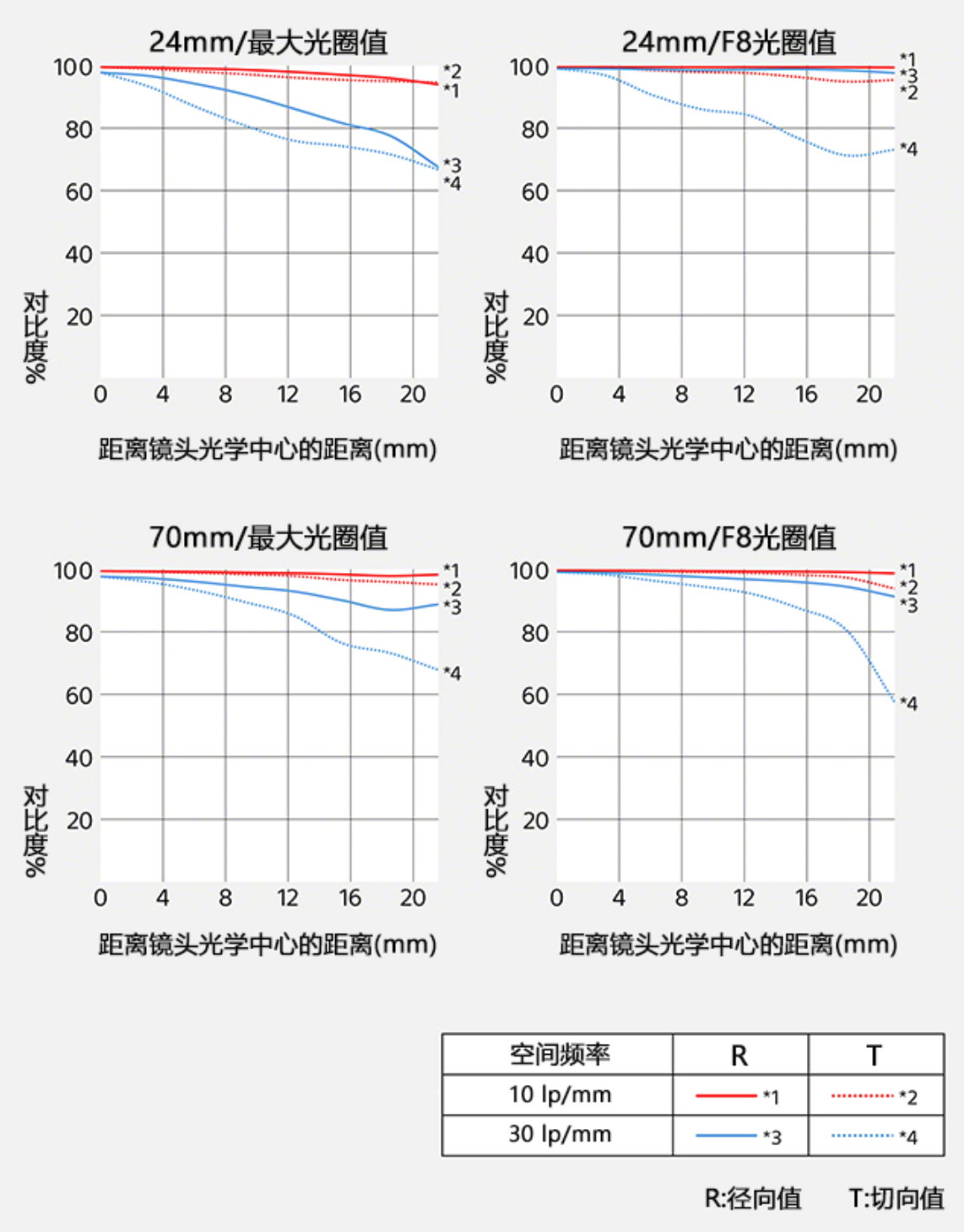 镜头在24mm有比较明显桶型畸变,在70mm有比较明显枕型畸变。