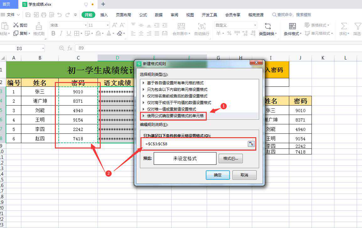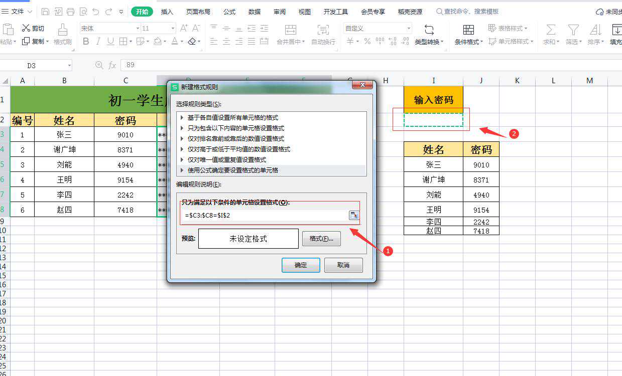 (1)在弹出的【新建格式规则】对话框内选择【使用公式确定要设置的单元格】-在规则说明那里选择表格密码那一列数据
