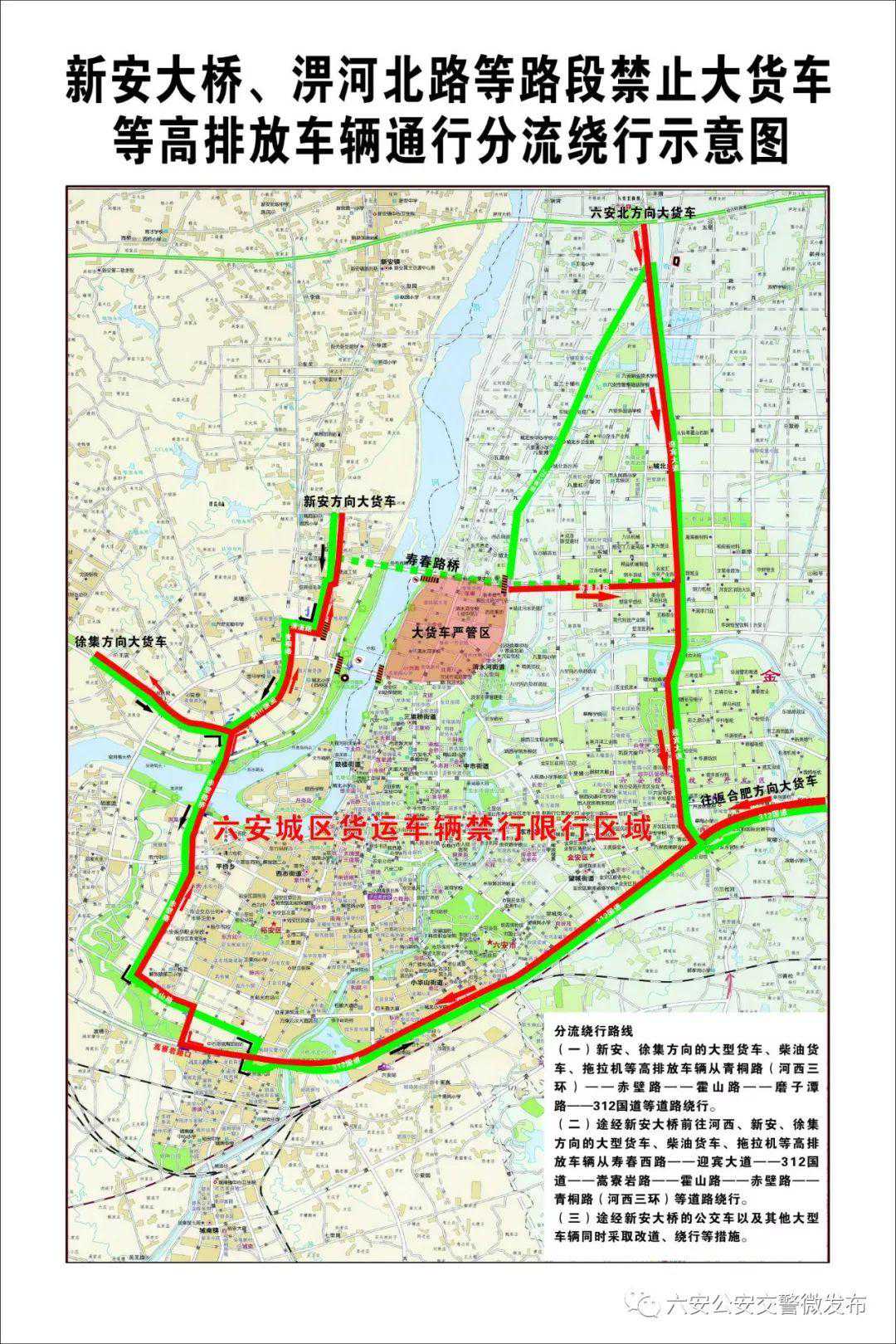 (二)途经新安大桥前往河西、新安、徐集方向的大型货车、柴油货车、拖拉机等高排放车辆从寿春西路——迎宾大道——312国道——嵩寮岩路——霍山路——赤壁路——青桐路(河西三环)等道路绕行。
