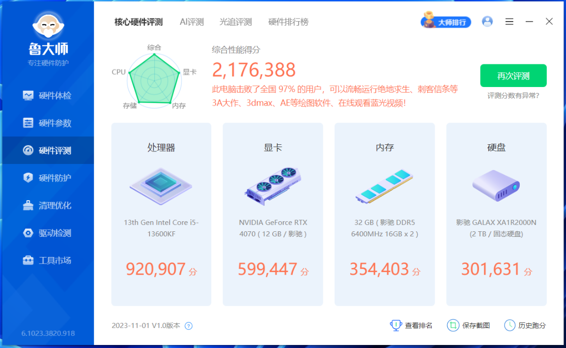 电源方面,选择的同样是来自影驰的名人堂HOFGH-850白金牌全模组电源。全日系电容,80plus金牌认证,支持最新的电源规范和PCIE5电源标准,跟4070显卡当然也能更搭。