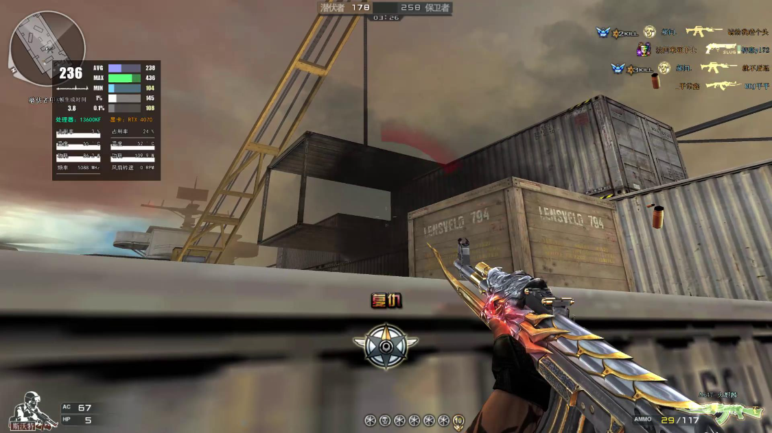《CrossFire穿越火线》实际游玩体验,4K分辨率,画质最高,整体画质预设为品质优先,在运输船地图中,游戏帧数全程保持在235帧以上,显卡功耗保持在100W左右,占用率则保持在30%以下。