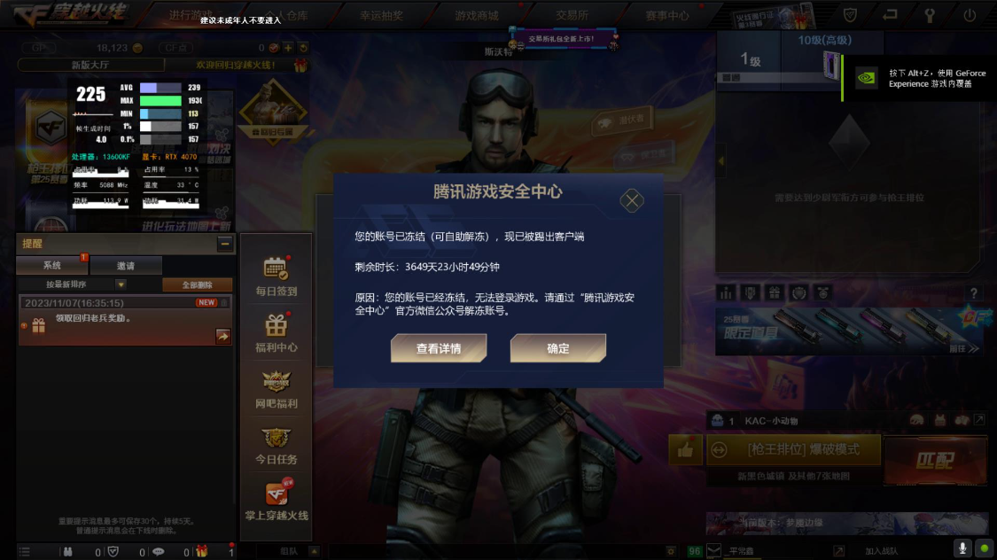 聊回主机本身,270°大视角的海景房将白色配件组合的高颜值展示得也算是相当到位,至于涂装部分,你也完全可以进行私人定制。配置方面,13代i5+RTX4070显卡的组合,也已经能够很好地满足绝大部分玩家的游戏/生产力需求。至于CF,实测证明,咱是真的可以轻松拿捏的。