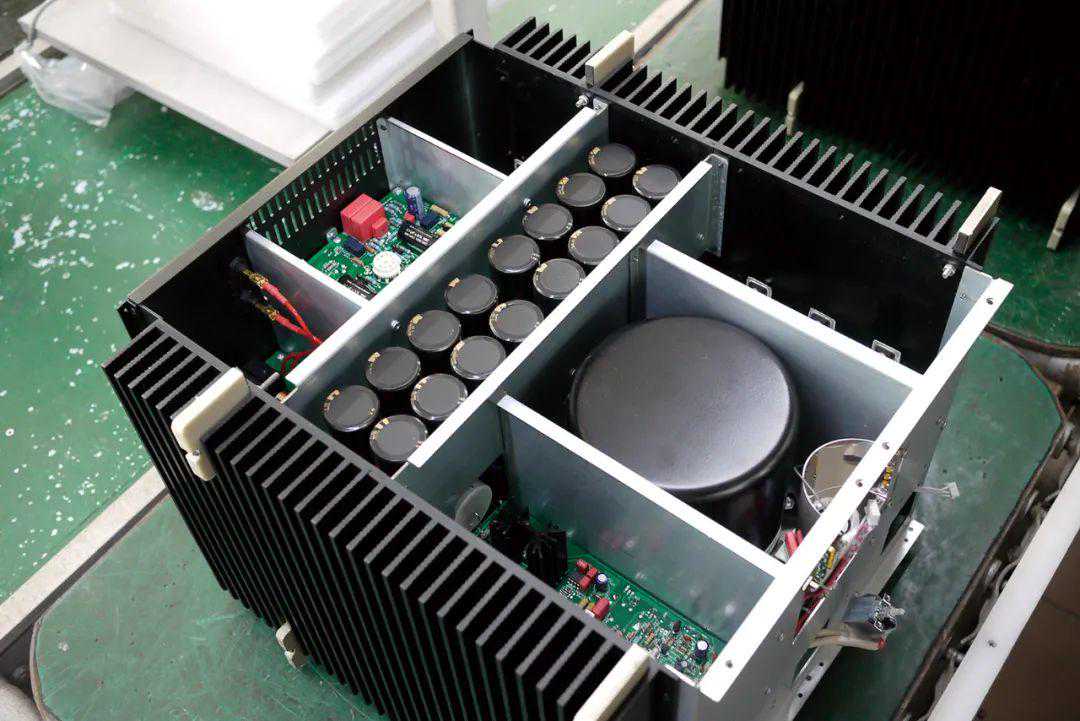 从顶板上的散热网可看到机内的功率放大部分的滤波电容,总共用了16支10000μF音响级的电解电容。机箱前面的空间几乎被一只环形电源变压器完全占据,功率高达1500W,为整机强大的输出提供充裕的能量。靠近背板的独立空间是输入级线路,上面可见到有3支电子管,其中一支ECC81是输入缓冲级,其余两支为每声道各一支ECC88用作驱动晶体的电压放大级。其中,输入级和推动级之间的交连电容也选用了德国Mundorf蒙多福的M-Cup银膜油浸电容,而驱动级到后级晶体管线路之间的电容也是Mundorf的出品。因此这款后级其实是电子管和晶体管混合线路功放,采用电子管作为信号输入电压放大,全部电子管都采用捷克JJ的订制品,结合晶体管作电流放大输出。