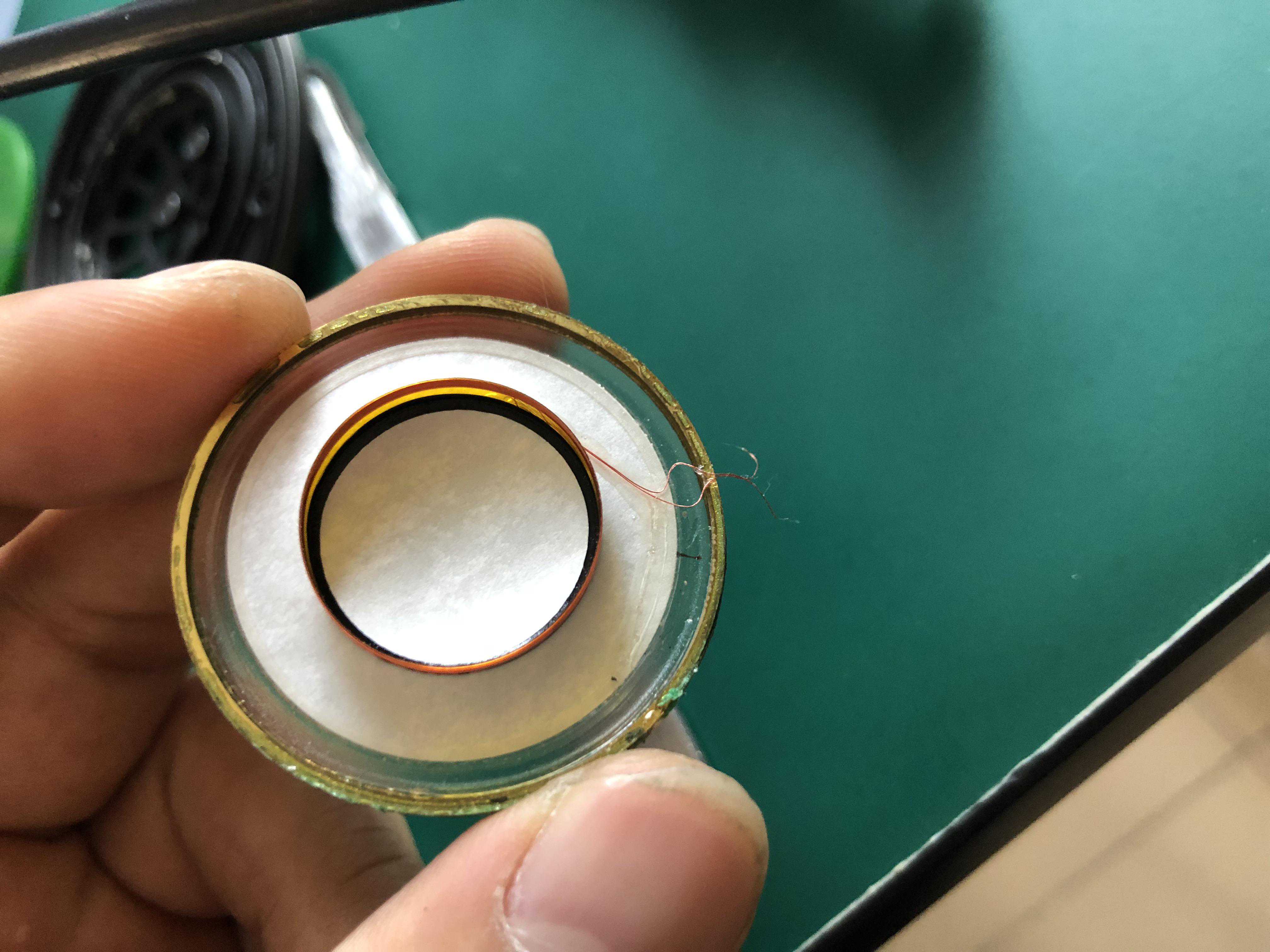解胶后,分离振膜和支架,发现音圈线就断在铜环位置,引线走线是9型的,对重新引线不担心了,剩下的长度足够;这个支架磁路部分,和上次拆的solo3大小类似,看起来调音阻尼不同,也许磁力级别也不同,磁力不会被环境轻易改变就不检测了