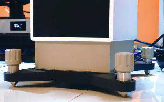 看起来壮观无比的底座内藏玄机,这是整块实心铝挖出不同孔径,再按需求填充不同阻尼材料把震动化解掉,最后加上巨无霸的金属脚钉。在低音柱内底座内藏5000瓦的D类功放,用来推动总共6只13吋的超长冲程低音单元,最低发出惊人的10Hz极低频。