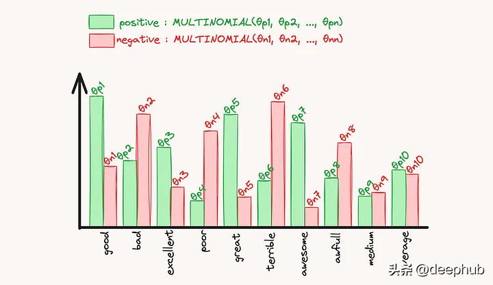 贝叶斯定理允许我们计算样本属于给定类别y的概率。创建一个空分类器,计算新样本属于所有类的概率,并返回概率最大的类。为了能够计算贝叶斯方程的概率,我们丢弃分母p(x),因为在比较每个类时它并不重要。然后需要使用假设所有特征都遵循多项分布来简化可能性项,对于每个类(朴素独立性实际上是内置在多项分布中的)。然后使用多项分布的概率质量函数来计算给定样本属于一类的概率。