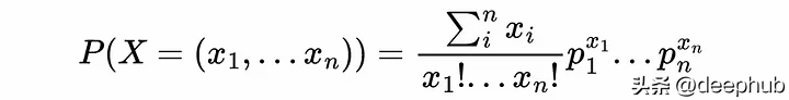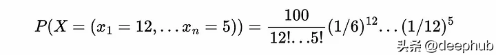 这个示例展示了如何在给定相关概率(所有pi)的情况下计算观察给定结果(所有xi)的概率。这很重要,因为它将有助于计算给定样本X=(x1,…,xn)属于分类问题中可能的多项分布p=(p1,…,pn)的概率。