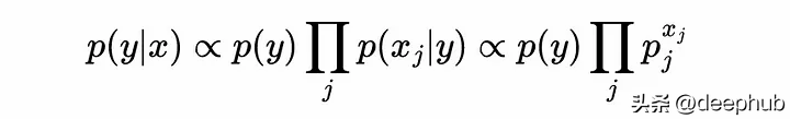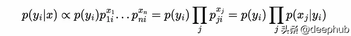 与类先验(p(yi))成正比乘以p(xj|yi)的所有j的乘积,这是在给定样本属于类yi的情况下,观察到特征j的xj结果的概率。