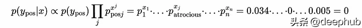 相应的概率是1e-4的数量级,这个数量级很小,计算机可以很好的处理这样的数字,所以现在没有问题。但是当计算样本属于一个类时,问题就出现了,这个概率如上所示,通过取所有p_j^{x_j}的乘积得到,其中p_j是单词j的估计概率,x_j是单词j在测试样本中出现的次数。我们得到: