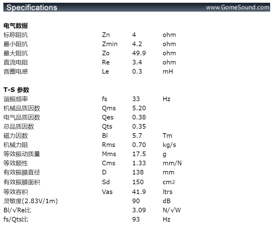 实际上,市面的单元都是些基本型号,在不知道你的要求的情况下,单元厂是不可能有针对性的,因此只能算是“标准型号”。但扬声器又偏偏是不标准的,而是高度定制化的行业。并不像鞋一样,报个脚码就行。下图是低音扬声器的典型参数,那不是一个脚码而是二十几个,这还不包括高音扬声器。而其中一个不合适,最终的声音就会或多或少有问题: