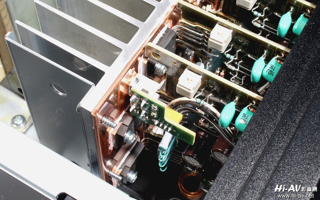 本机的13声道后级各自都有独立的电路板,有7个声道后级电路板安排在机箱左侧、另外6声道后级电路板安排在机箱右侧。从这张特写照片可发现每声道电路板、Denon特别订制的DHCT高电流功率晶体管,是采用类似西洋棋盘的交错方式上下配置,这部分与先前我们评测过的AVR-X6400HAV功放类似。这样的功率晶体排列可让散热片的整体温度更均匀、散热效率更提高,而Denon更为AVR-X8500H在散热片与功率晶体管之间再多加了一块铜板,如此可进一步让所有功率晶体管及散热片的温度更为均匀。