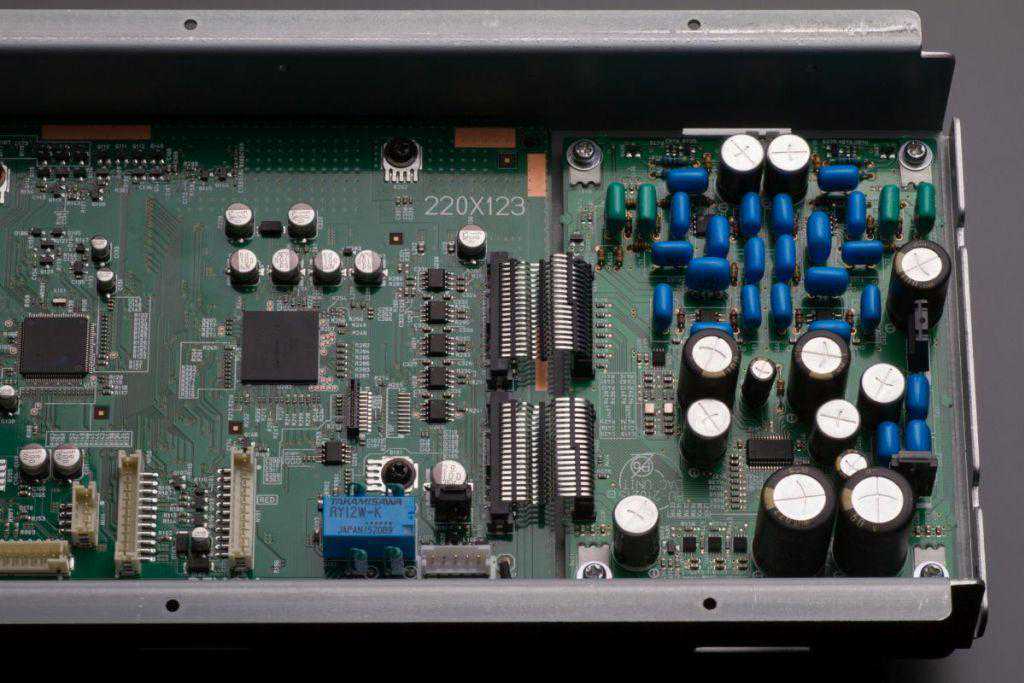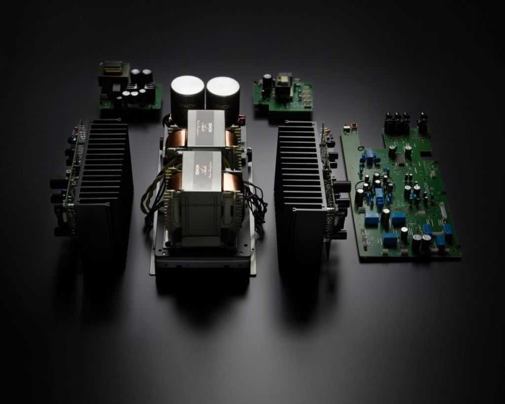 高电流输出背后,是充裕的供电架构,一对大型EI变压器镇守机身中央,以相反方向安装,令它们互相抵销磁漏,减少干扰;贴近机背位置是一对巨型电解电容,每支容量为12,000μf。