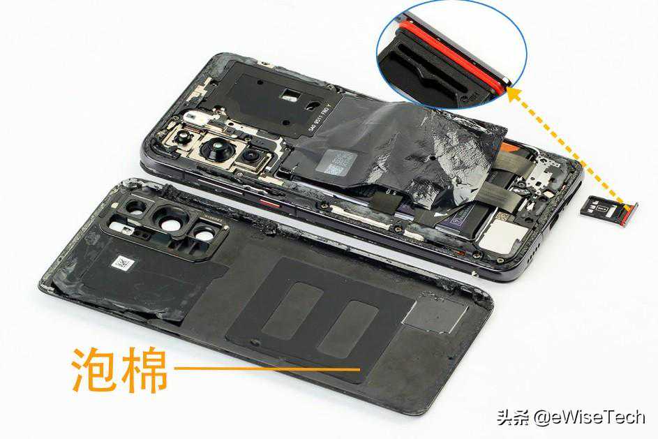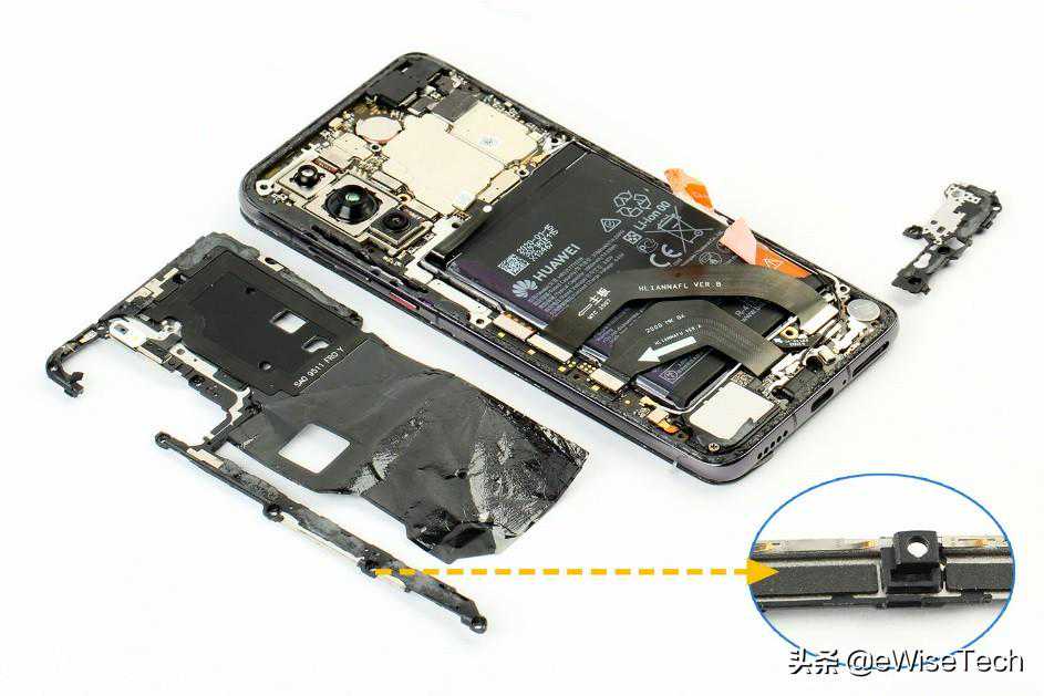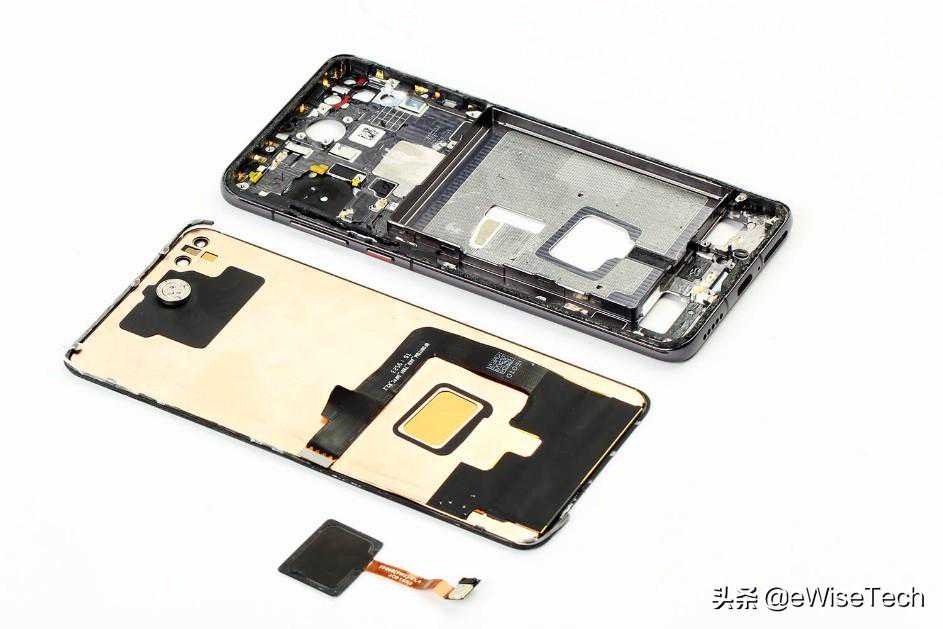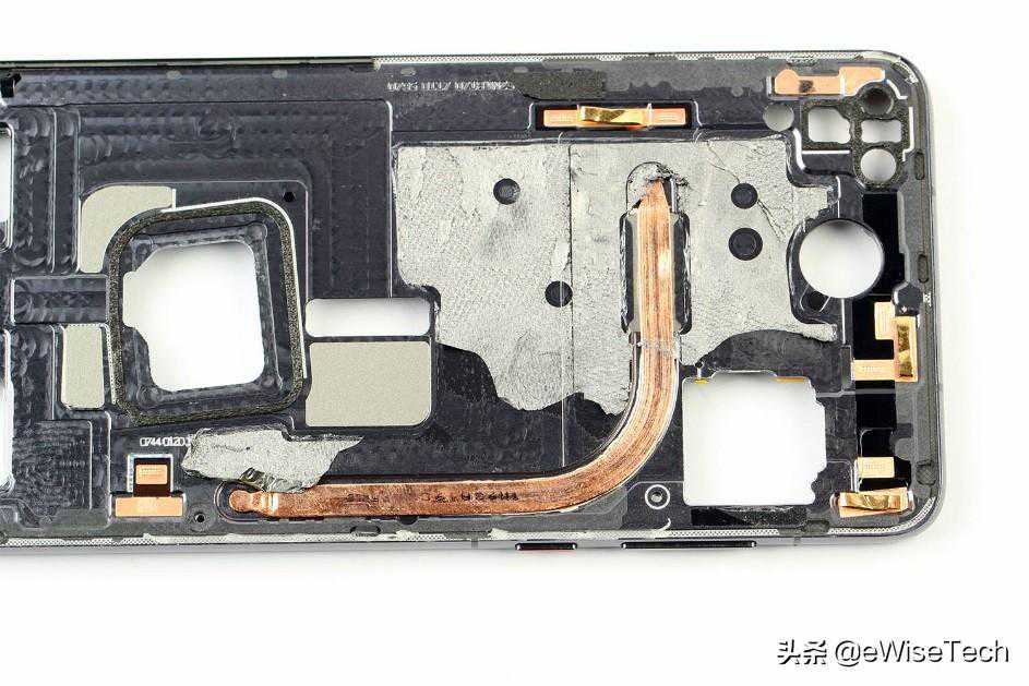 回顾一下,华为P40采用三段式设计。后盖与内支撑、电池以及屏幕的固定都非常牢固。P40也再一次使用了屏幕发声组件替代了听筒。其内部通过石墨片+散热硅脂+液冷铜管的方式进行散热。电池位置上也贴有大面积石墨片用于散热。