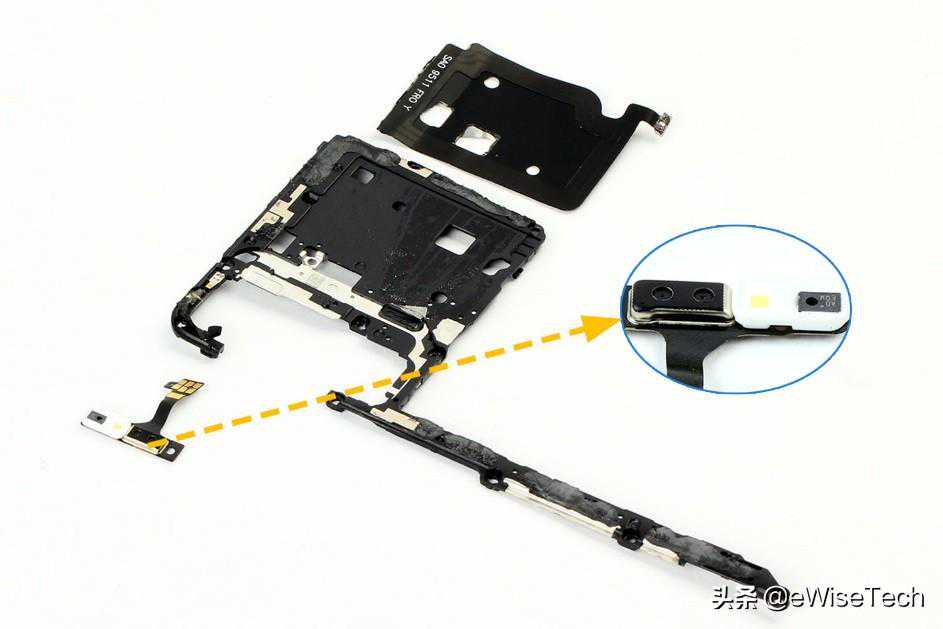 闪光灯传感器软板和NFC线圈通过胶进行固定,依次取下。软板上套有白色硅胶套用于保护。