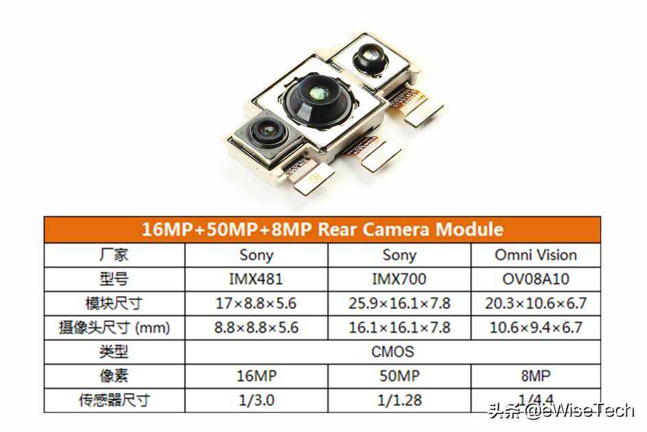800万像素长焦摄像头,型号为OmniVisionOV08A10,5000万像素主摄像头,型号为SonyIMX700;1600万像素广角摄像头,型号为SonyIMX481。