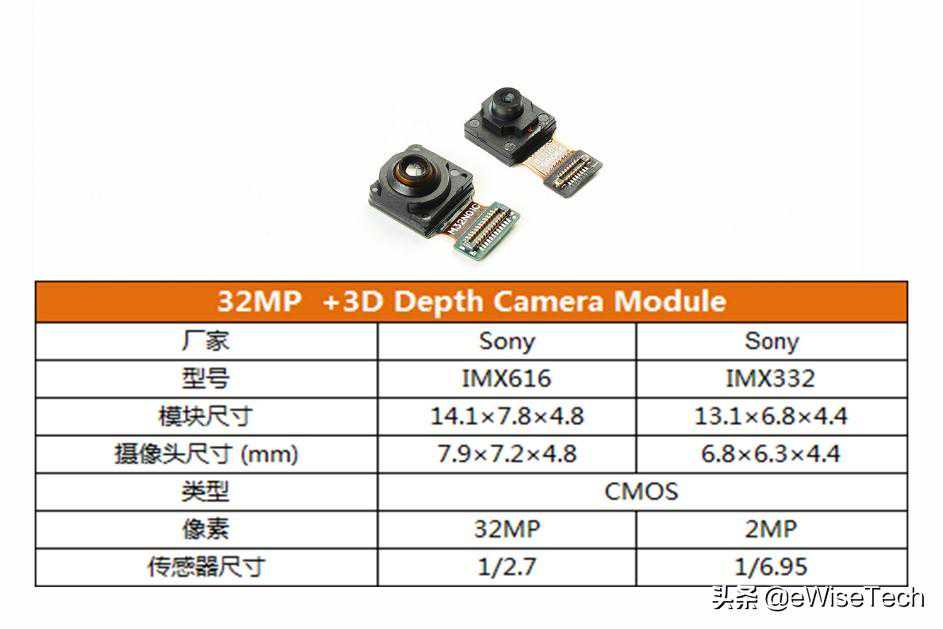 前置3200万像素摄像头,型号为SonyIMX616;红外景深摄像头,型号为SonyIMX332。