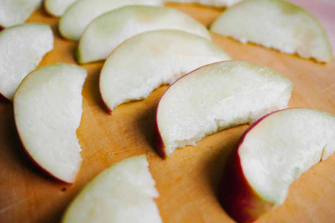 桃子一定要选脆桃,口感好,肉质紧实。洗净之后切1厘米的厚片,冬天的桃子脆脆的,水分少,可以切小块,更入味。夏天的桃子大、水分足,切大一点口感会更好。