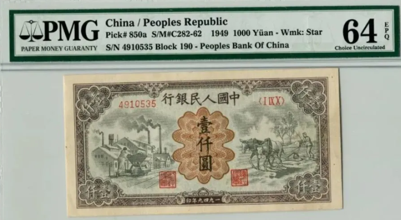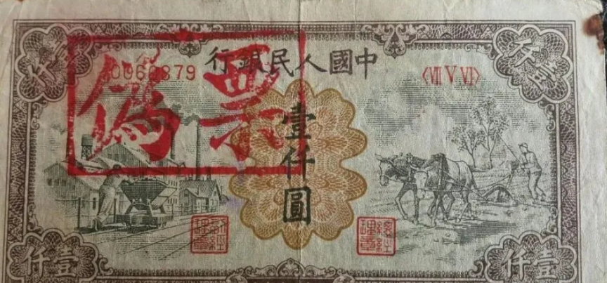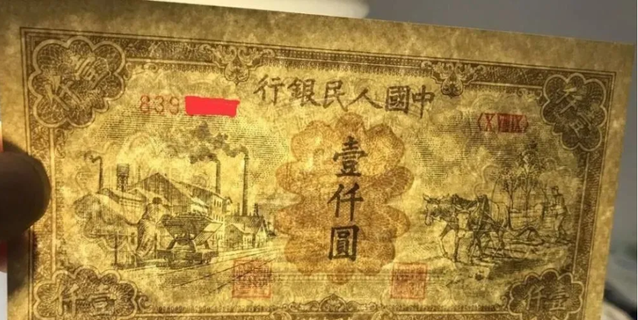 第一版人民币壹仟圆运煤与耕田正面