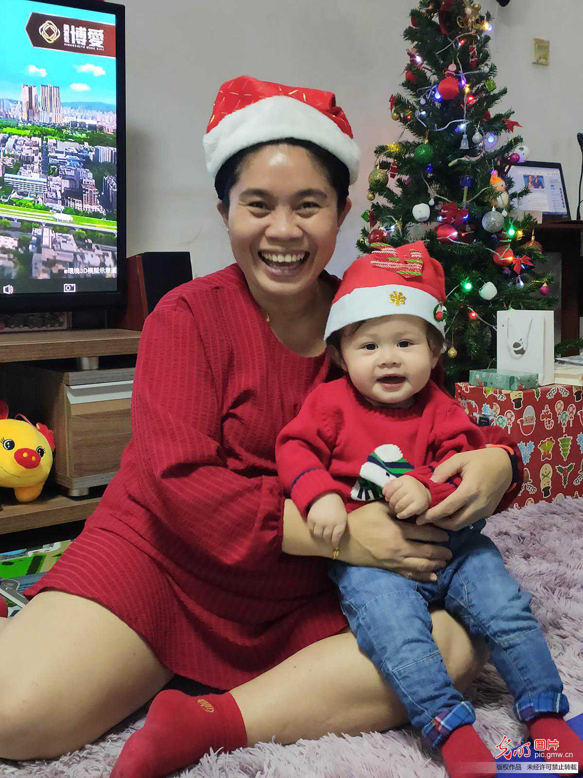外籍居民LACATANGOGRACE与儿子在北京的第一个圣诞节。(北京市顺义区空港街道香蜜湾社区供稿)LacatangoGrace,aforeignresidentwascelebratingherfirstChristmasinBeijingwithherson.(ContributedbyXiangmiwanCommunity,KonggangSubdistrictofBeijing’sShunyiDistrict)