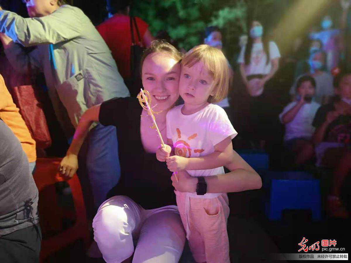 外籍居民NINA和孩子在中外文化交流汇演活动中品尝糖人。(北京市顺义区空港街道香蜜湾社区供稿)Ninaandherdaughterweretastingsugar-figureataChinese-ForeignerCultureExchangeEvent.(ContributedbyXiangmiwanCommunity,KonggangSubdistrictofBeijing’sShunyiDistrict)