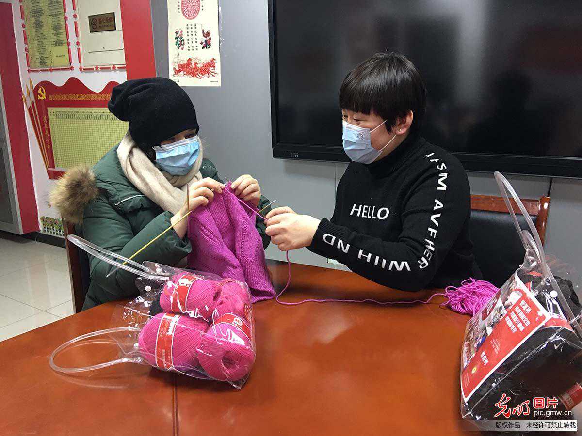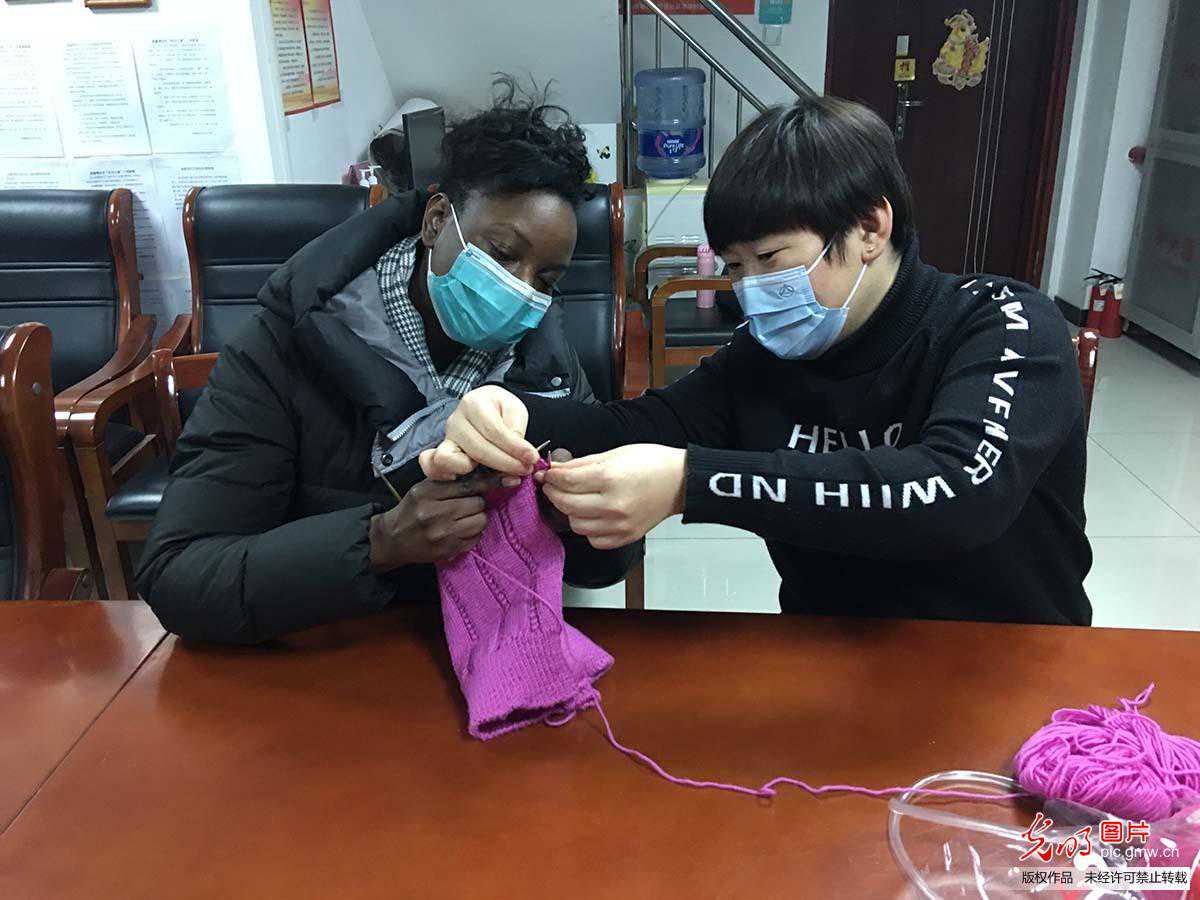 外籍居民Delisa为新疆和田地区孤残儿童编织毛衣。(北京市顺义区空港街道香蜜湾社区供稿)DelisawasknittingasweaterfororphansofHotan,Xinjiang.(ContributedbyXiangmiwanCommunity,KonggangSubdistrictofBeijing’sShunyiDistrict)