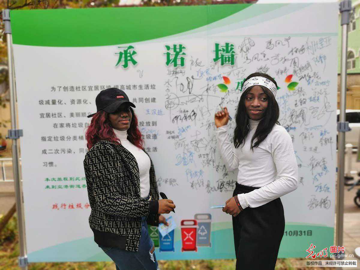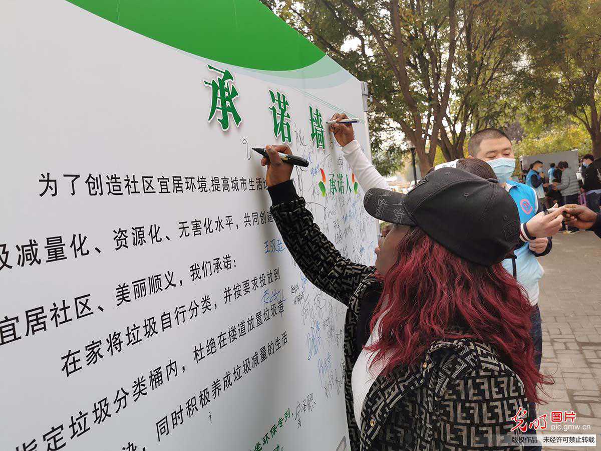 外籍志愿者VERONICAWARITAY参加垃圾分类活动,并做出承诺。(北京市顺义区空港街道香蜜湾社区供稿)VeronicaWaritay,aforeignvolunteer,pledginghercommitmenttothegarbagesortingcampaign.(ContributedbyXiangmiwanCommunity,KonggangSubdistrictofBeijing’sShunyiDistrict)