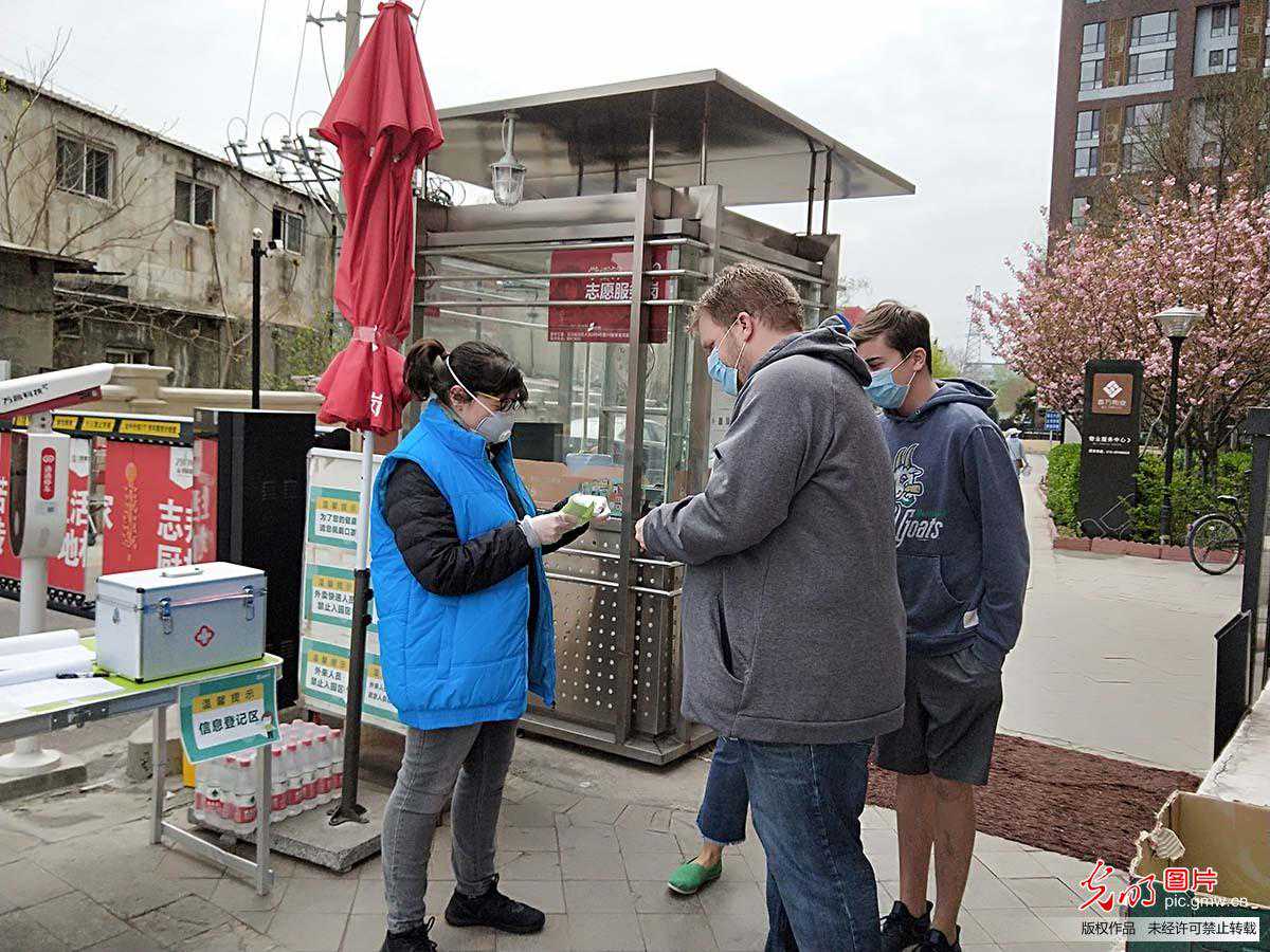 外籍志愿者娜娜和卡尔蒂卡疫情期间在小区入口执勤,检查体温。(北京市顺义区空港街道香蜜湾社区供稿)NanaandKartikavolunteeredtotaketemperatureforincomingresidentsattheentranceofcommunity.(ContributedbyXiangmiwanCommunity,KonggangSubdistrictofBeijing’sShunyiDistrict)