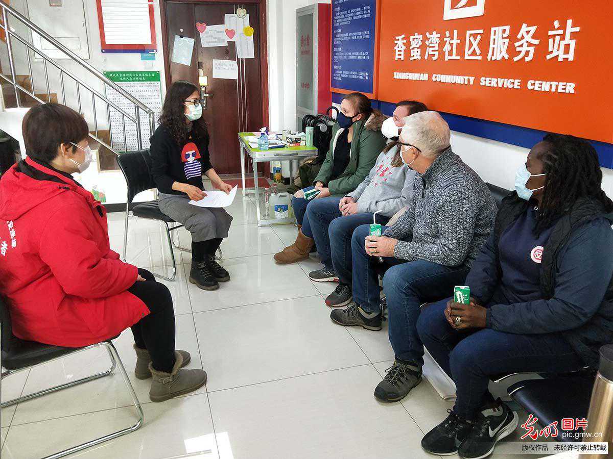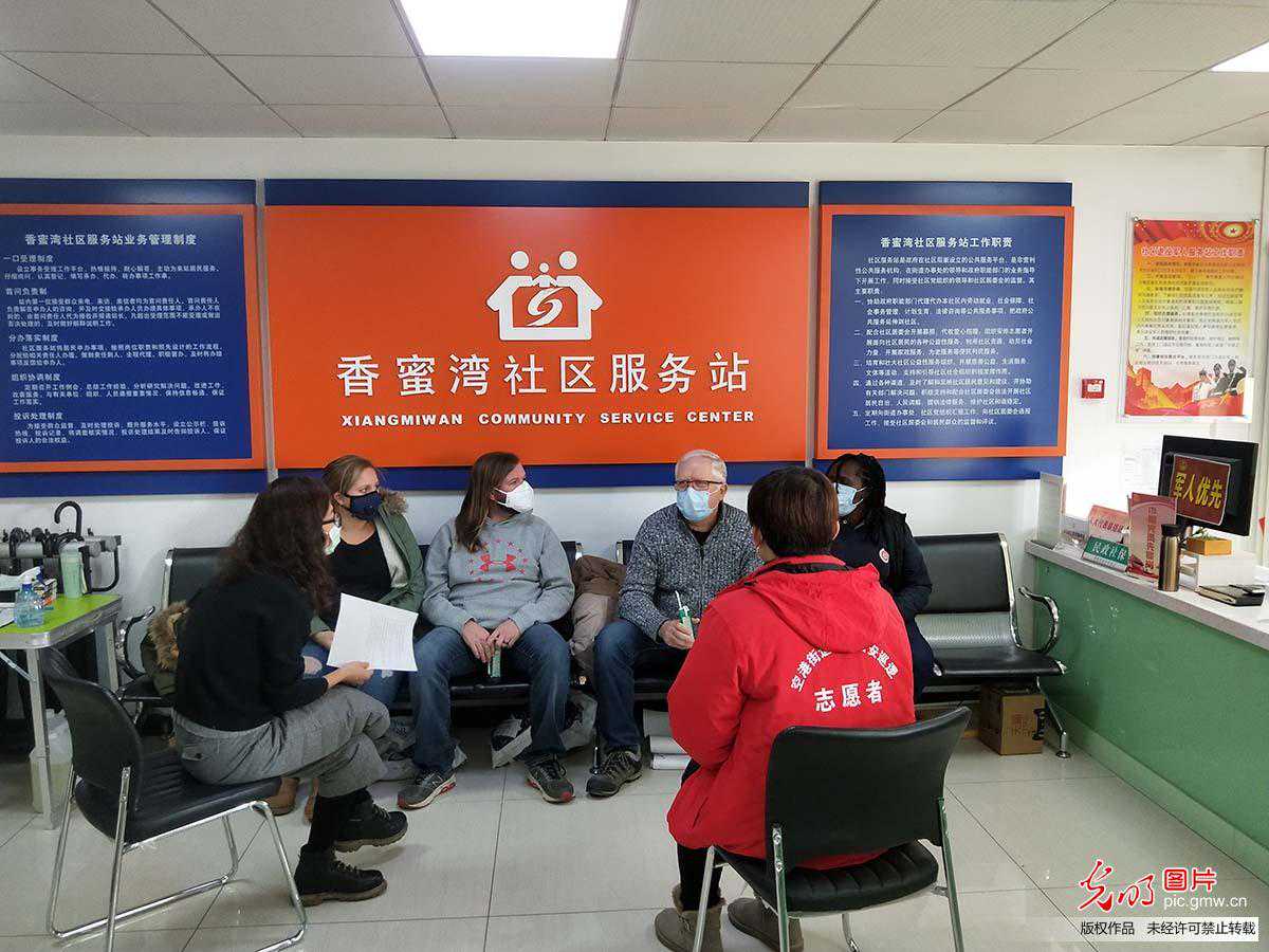 外籍志愿者参加门岗值守活动会谈。(北京市顺义区空港街道香蜜湾社区供稿)Foreignvolunteerswerehavingameetingonthepandemicproventionandcontrolarrangement.(ContributedbyXiangmiwanCommunity,KonggangSubdistrictofBeijing’sShunyiDistrict)