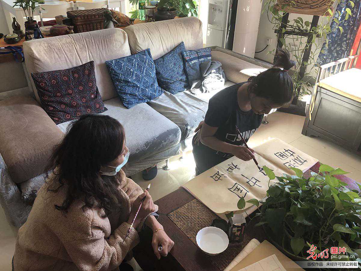 外籍志愿者卡尔蒂卡学写毛笔字为中国抗疫加油。(北京市顺义区空港街道香蜜湾社区供稿)ForeignvolunteerKartikawaswritingcalligraphytocheeronChina’sfightagainstCovid-19.(ContributedbyXiangmiwanCommunity,KonggangSubdistrictofBeijing’sShunyiDistrict)