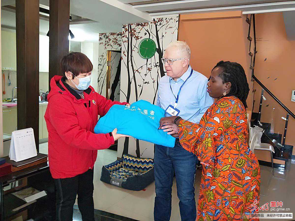 社区工作者给参与社区疫情防控的外籍志愿者娜娜和洛林发放志愿者工作服。(北京市顺义区空港街道香蜜湾社区供稿)AcommunityworkerwasdistributingvolunteeruniformstoforeignvolunteersNanaandLorraine.(ContributedbyXiangmiwanCommunity,KonggangSubdistrictofBeijing’sShunyiDistrict)