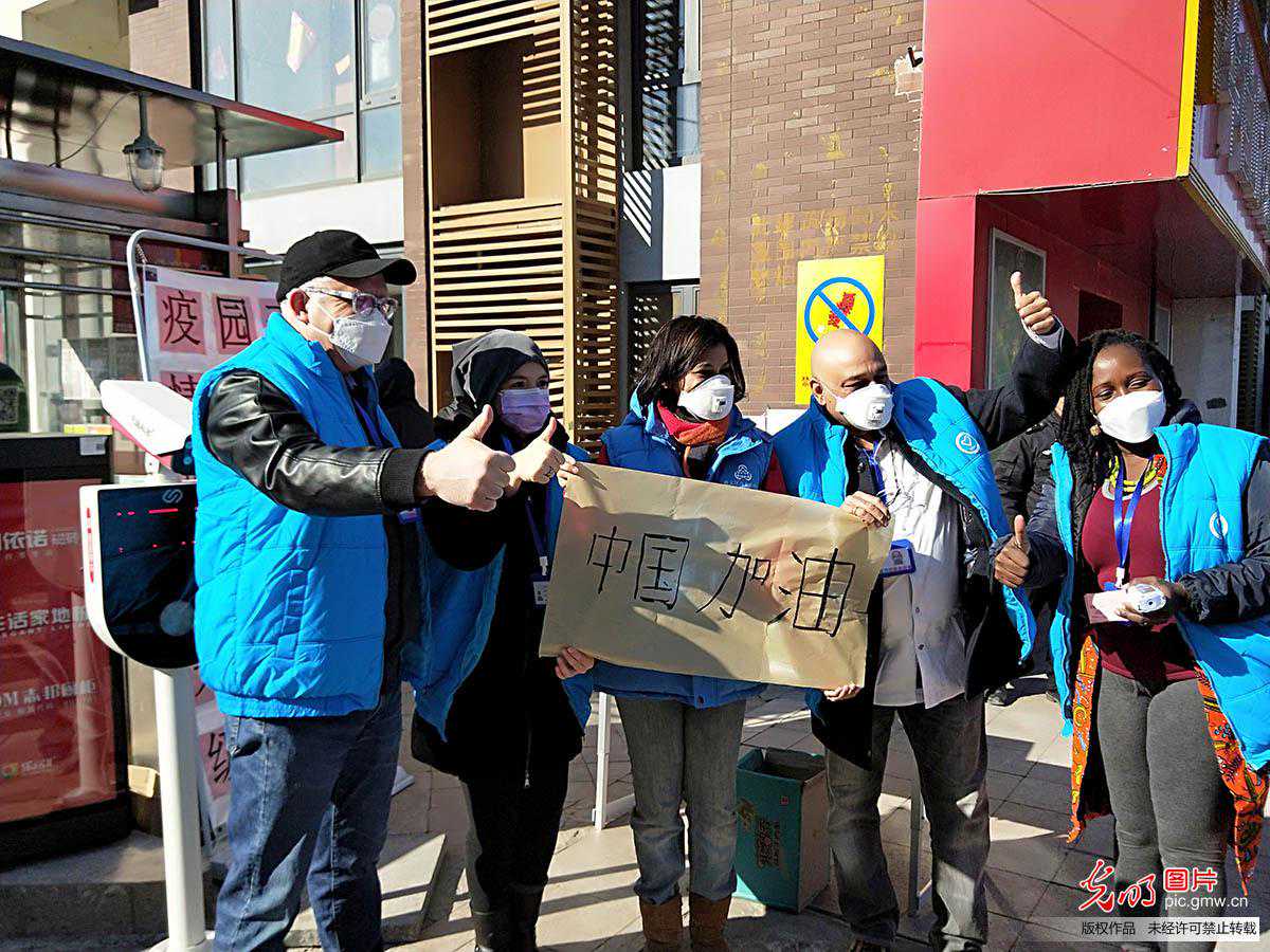 外籍志愿者交流门岗值守经验。(北京市顺义区空港街道香蜜湾社区供稿)Foreignvolunteerswereexchangingtheirexperiencewhileworkingforthepandemicproventionandcontrol.(ContributedbyXiangmiwanCommunity,KonggangSubdistrictofBeijing’sShunyiDistrict)