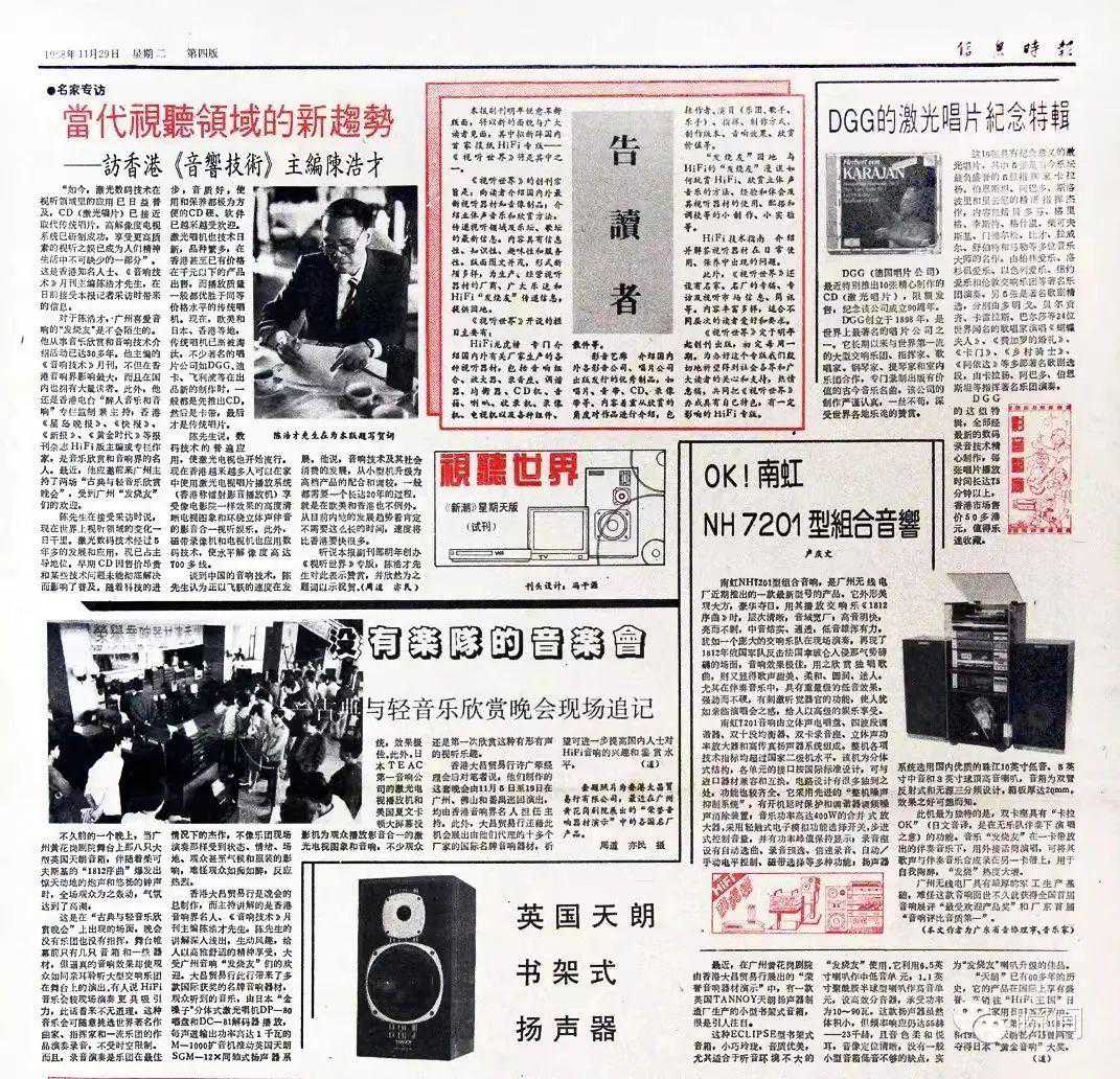 真正掀起广州音响热潮的是一张小小的报纸——《》Hi-Fi版。这个专版创办时每星期天出一次,由编辑周道先生和几位发烧圈中的老大哥系统地介绍音响器材、音响知识以及软件欣赏。各种文章通俗易懂、生动有趣,开始为广州人撩起发烧音响那神奇的面纱,而通过“土炮大赛”等系列活动使其产生越来越大的影响力。1992年是《》Hi-Fi版迈向新纪元的一年。这年Hi-Fi版不仅在上海等地成立分印点,而且还在《》众多专版中首出彩色版,逐步成为国内音响文化推广的核心。