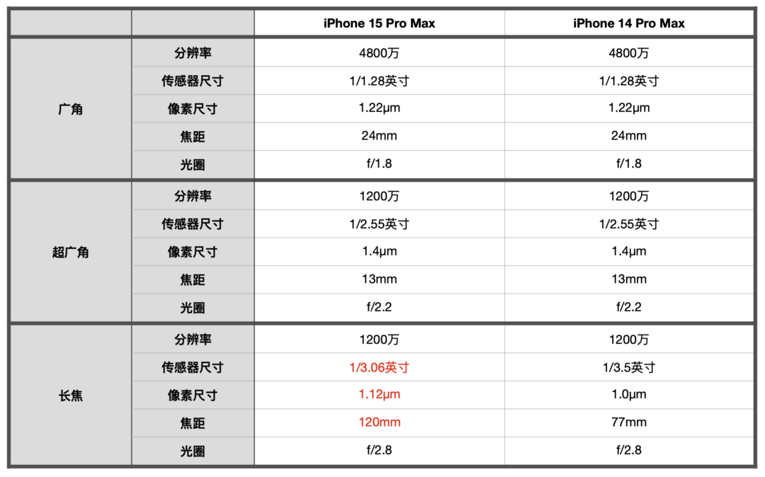 从参数图上我们可以发现,从硬件上来看,iPhone15ProMax的主摄广角以及超广角镜头均保持了上一代的硬件配置。长焦镜头则升级为了120mm焦段的5x镜头,并且传感器也从上一代的1/3.5英寸增加到了1/3.06英寸,再加上单像素尺寸的增加,理论上iPhone15ProMax的长焦镜头画质表现应该要比上一代更加出色。