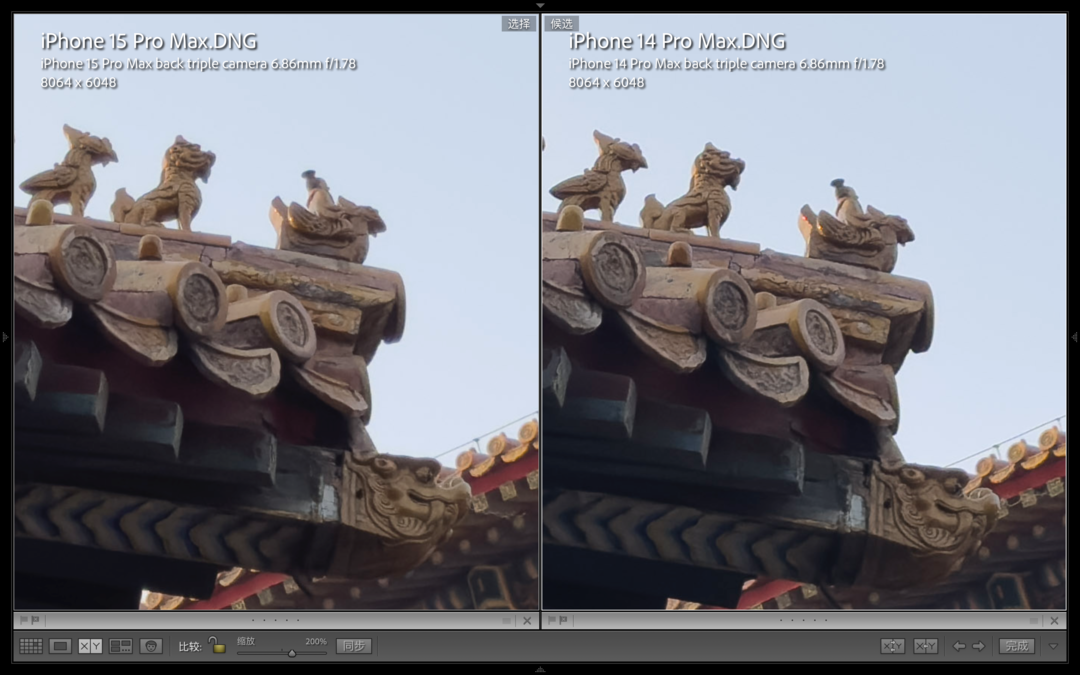在白天光线充足的环境下,我们实际对比两台手机的主摄拍照效果,两台手机均拍摄的是4800万像素RAW照片。我们可以发现,两组样张放大后可以明显看出iPhone15ProMax相比上一代的锐化程度有所降低,尽管放大到200%观察细节锐度没有iPhone14ProMax那么夸张,但实际上缩小到实际大小的时候观感要更好一些。
