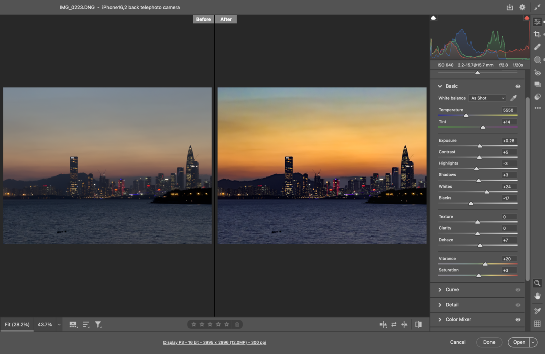 通过实际在CameraRaw中对DNG格式进行后期处理,我发现iPhone15ProMax的这枚长焦镜头的宽容度表现要比预想的好一些,尽管相比主摄的动态范围要小一些,但是也基本可以满足照片后期对曝光的调整和色彩的处理要求。