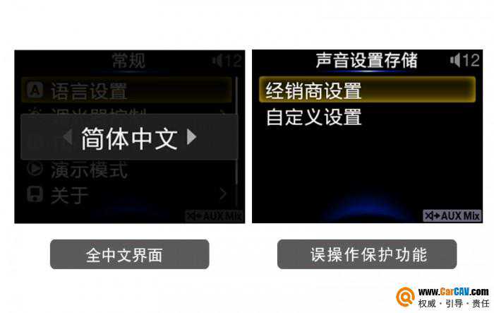 在控制面板上,首先映入眼帘的是一个2.4英寸的彩色液晶屏,可以显示操控的各类信息,包括歌曲播放的曲目和播放格式。液晶屏上呈现的是全中文界面、一键操作按键定义、误操作保护功能、歌曲格式识别等四大交互方式,让操作贴合车主的使用习惯。一键操作按键定义设定,如果车主进行了误操作,导致某些设置出现偏差,可通过误操作保护功能中的恢复经销商设置选项,一键恢复。