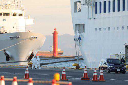 2月6日,在日本横滨,工作人员准备为“钻石公主”号邮轮运送物资。新华社/共同社