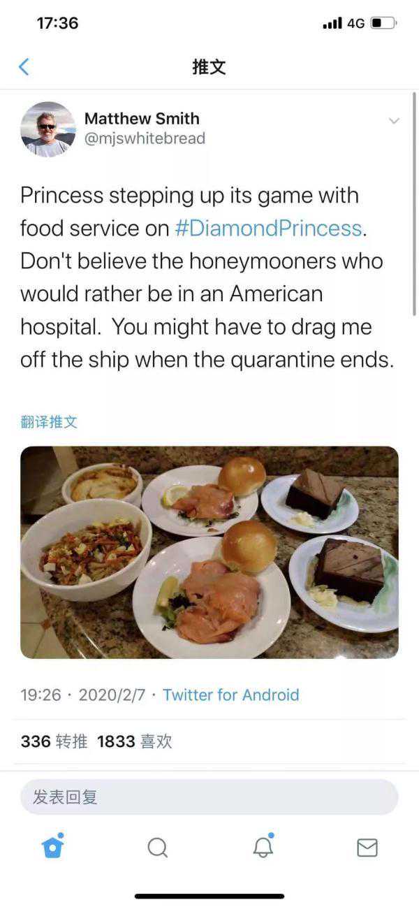 乘客马修·史密斯在自己“推特”账户上发布的“隔离日记”里,内容最多的便是一日三餐。