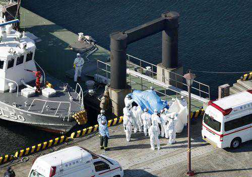 2月5日,在日本横滨港,防疫人员将“钻石公主”号邮轮上确诊的新型冠状病毒感染患者移向救护车。新华社/共同社