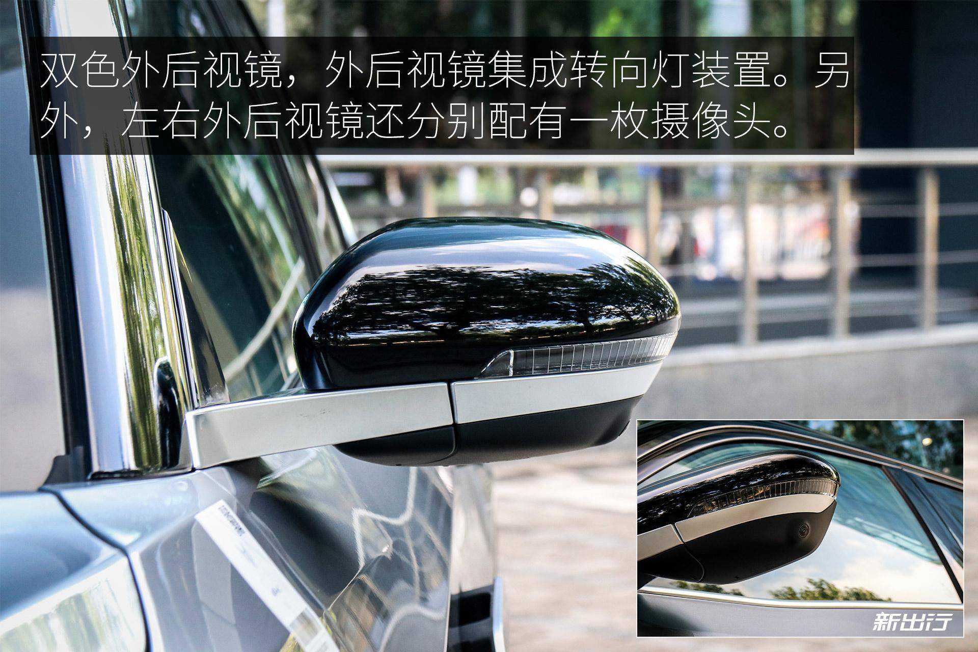 实拍片配有的是双色外后视镜,外后视镜集成转向灯装置。另外,左右外后视镜下方还分别配有一枚摄像头,为360度全景影像提供两侧画面。