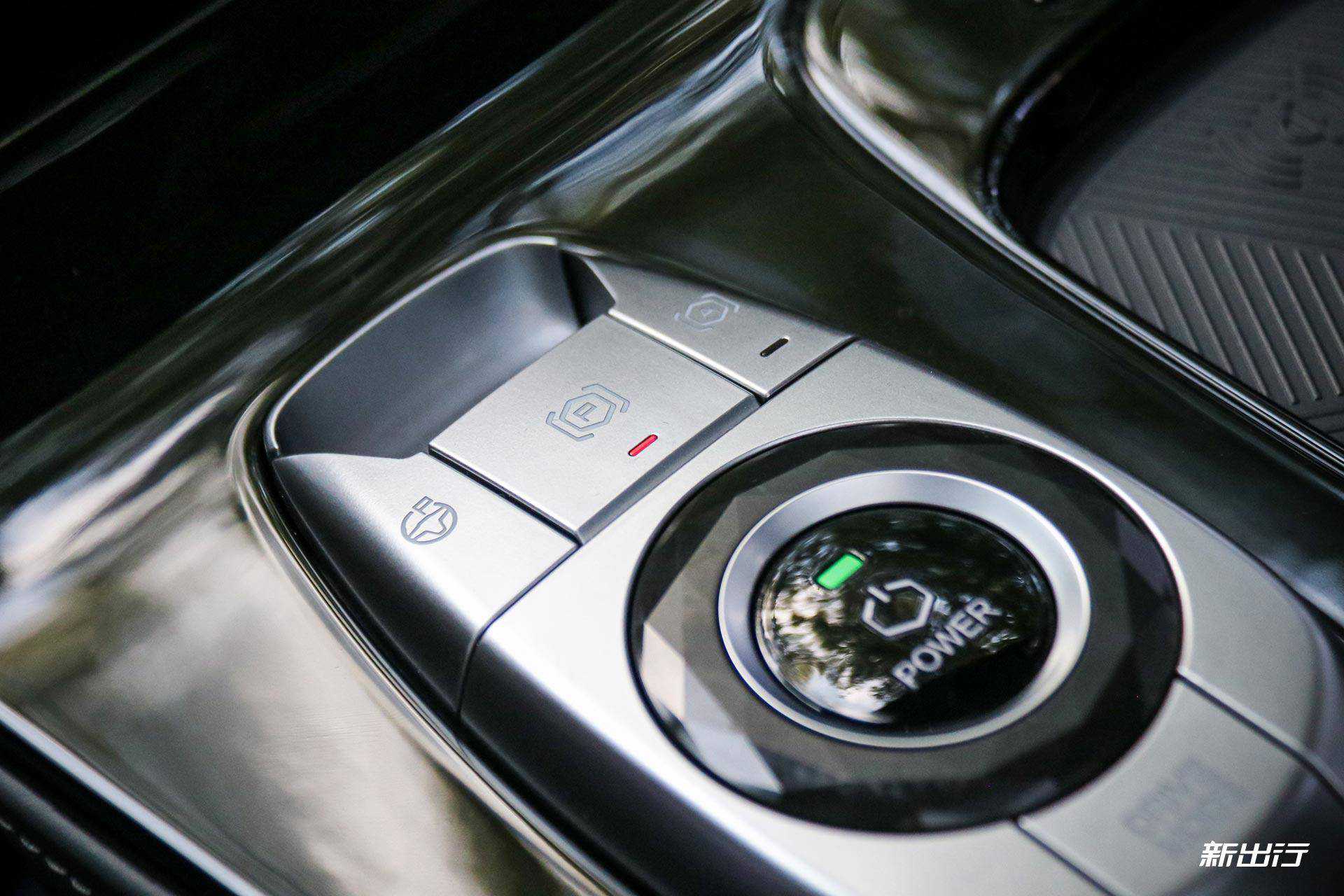 ARCFOXαT采用的是怀挡设计,并且车内保留了启动按键,周围是泊车按键、驾驶模式切换按键以及AutoHold按键,右侧提供了手机无线充电凹槽。后排也提供了独立的空调控制面板,同时也提供了两个USB口,此外还提供了全景天窗。