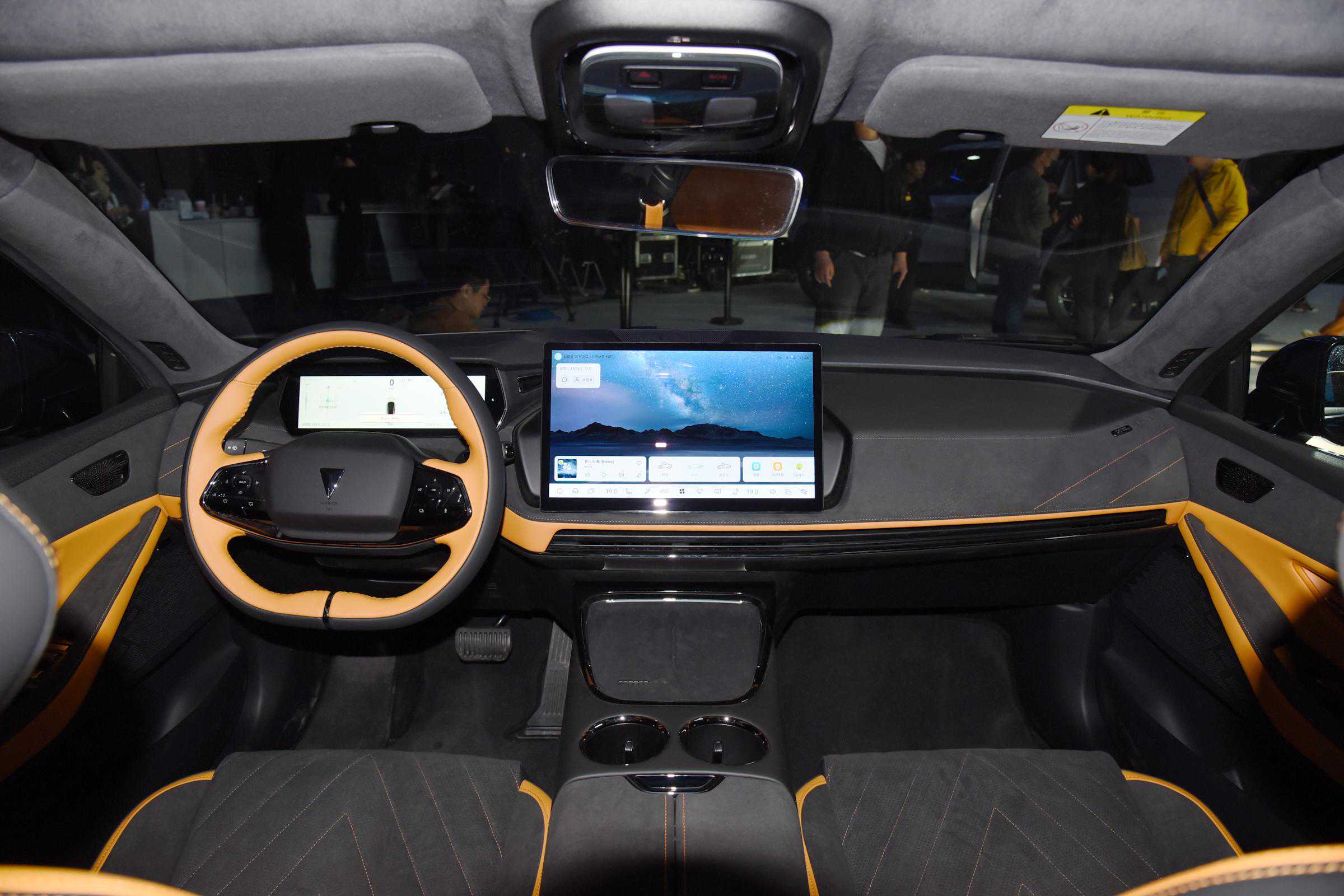 深蓝SL03两周年黑金骑士版的内饰采用了“星闪黑”配色,撞色搭配+大量的翻毛材质来提升运动氛围,在方向盘、门板、座椅以及扶手箱等位置,应用了流光黑装饰件,配备了电子怀挡机构、前排手机无线充电、10.2英寸液晶仪表、AR-HUD抬头数字显示和14.6英寸向日葵旋转中控大屏,车机使用高通骁龙8155芯片,支持车联网、OTA升级、语音连续识别、可见即可说等。