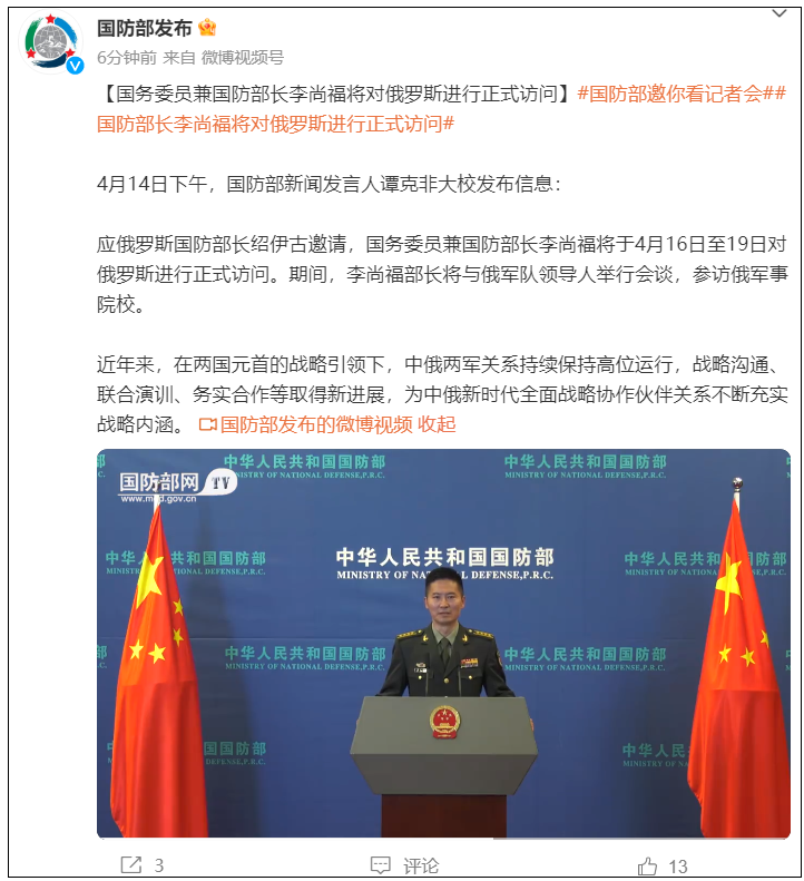 就在这个关键时刻,应俄罗斯国防部长绍伊古邀请,中国国防部长访问了俄罗斯!