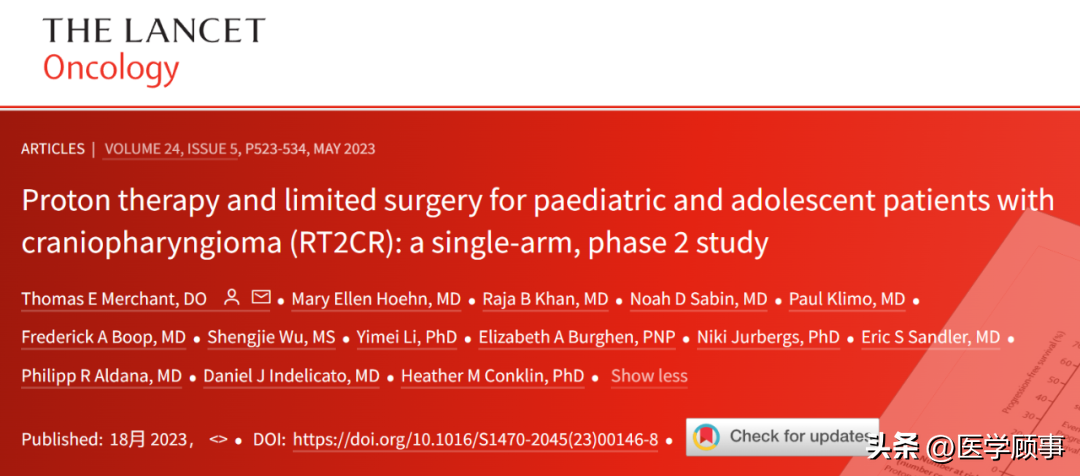 MerchantTE,HoehnME,KhanRB,SabinND,KlimoP,BoopFA,WuS,LiY,BurghenEA,JurbergsN,SandlerES,AldanaPR,IndelicatoDJ,swithcraniopharyngioma(RT2CR):asingle-arm,;24(5):523-534.doi:10.1016/S1470-2045(23)00146-8.:37084748.