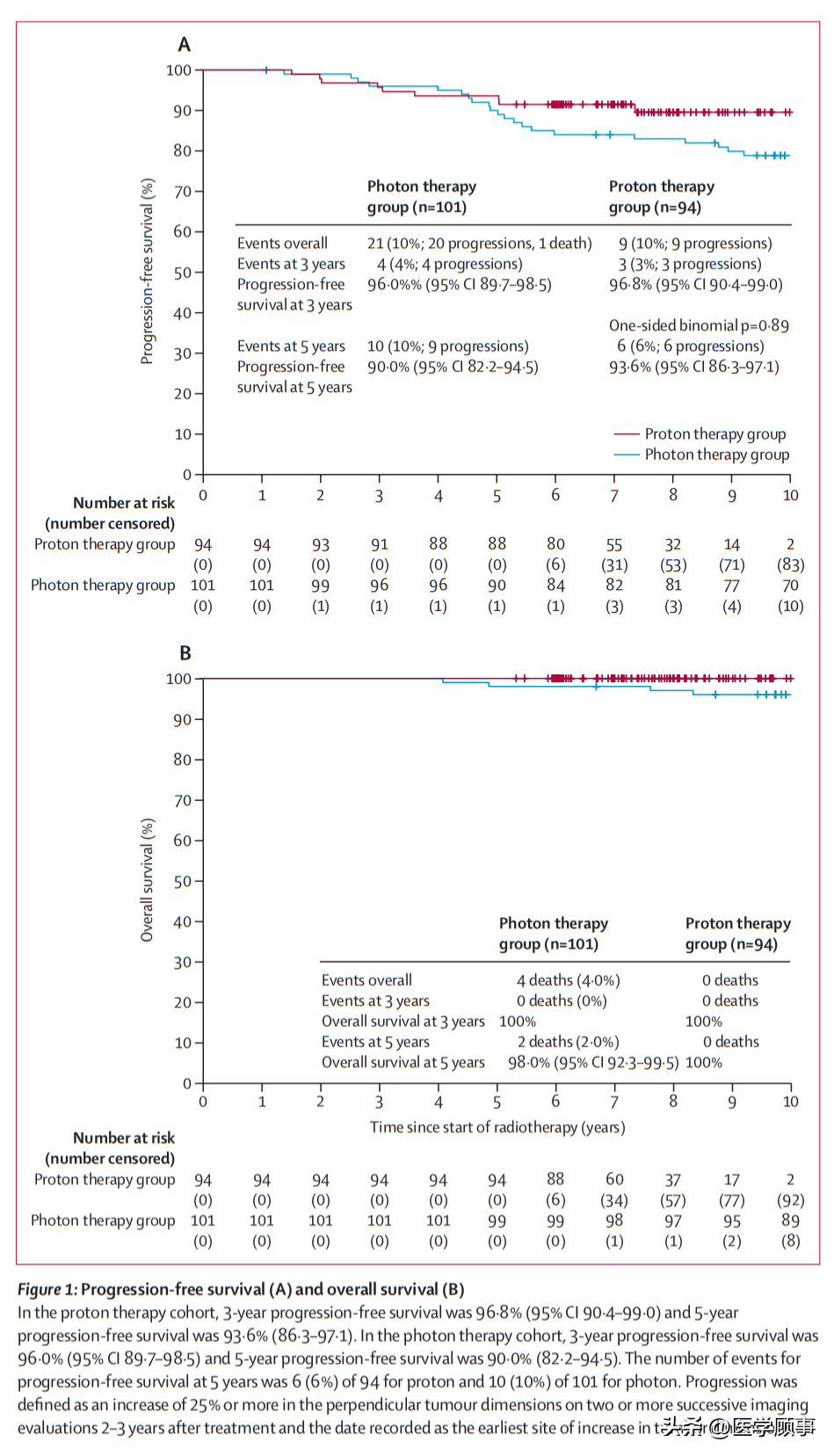 ThomasEMerchant及其同事对94名儿童(21岁;中位年龄9岁,IQR6-13)进行了一项为期5年的研究,并与在他们的机构接受光子放疗的101名患者进行了回顾性比较。从结果上看,他们发现在肿瘤影像学改变、血管病变、神经或视觉损伤以及内分泌功能障碍方面,质子治疗与传统光子治疗获得了相似的结果,但他们发现质子治疗与传统放疗相比,神经认知功能障碍显著减少。