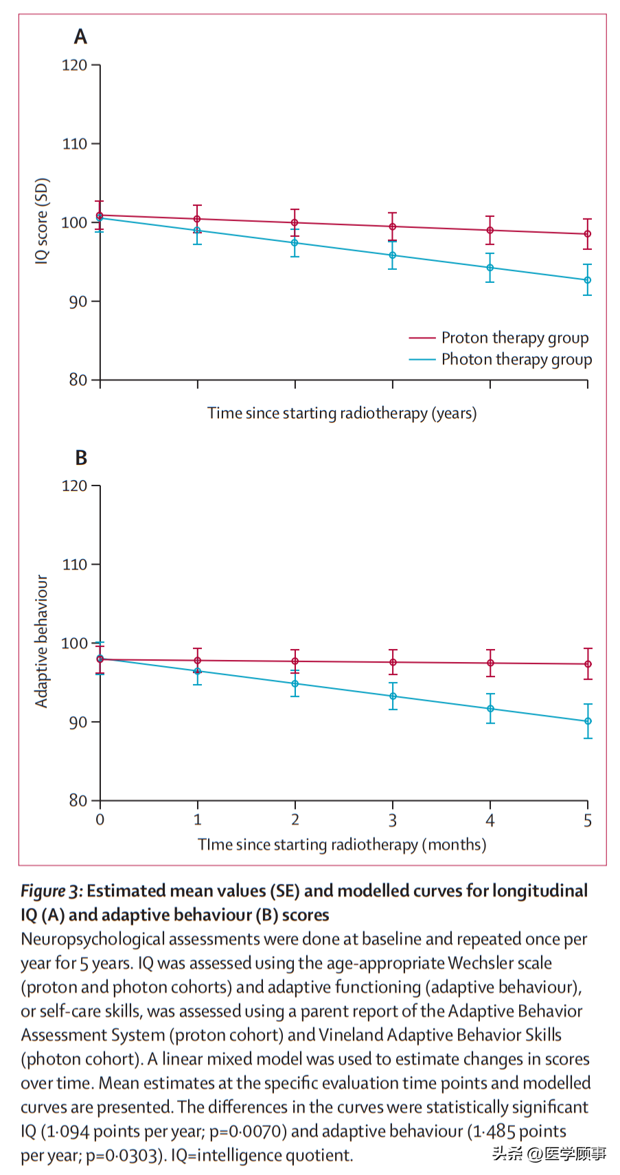 与既往队列相比,质子治疗没有改善儿童和青少年颅咽管瘤患者的生存结果,两组的严重并发症发生率也是相似的,但质子治疗对认知结果的改善效果却优于光子治疗。具体而言,在研究的5年中,光子治疗组患者的智商(IQ)分数平均每年比质子治疗组患者多下降1.09分。同样,光子治疗组患者的适应性行为评定量表(由父母填写的自我护理技能报告)分数每年比质子治疗组患者多下降1.48分。并且,研究结束时,质子组患者的认知缺陷情况继续保持稳定。
