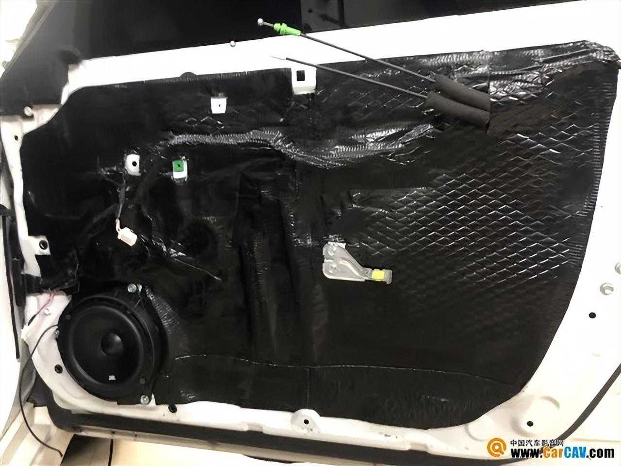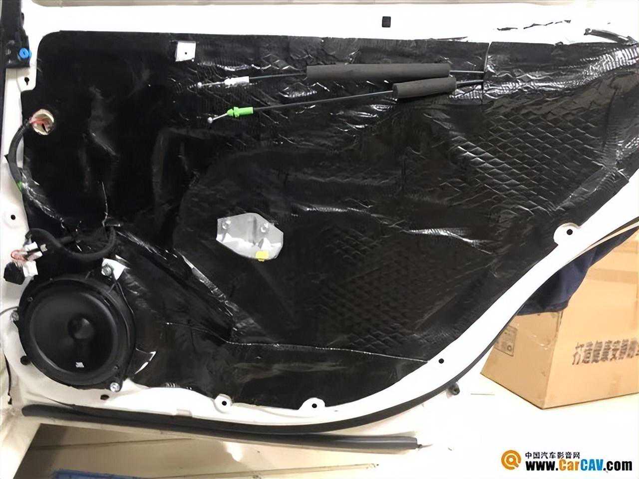 本来车门钣金就单薄,还没有隔音,空洞又多,共振和风噪明显也很正常!改装师使用黑鲨对四门进行止震隔音,减少共振和风噪的同时,也可以为门板上安装的喇叭打造一个较好的发声环境。前后声场选择升级一套美国JBL601C两分频喇叭,这个品牌致力于为广大车主打造高端极致的音响体验,堪称精品中的精品,可以说这是一套精准且有态度的音响产品。