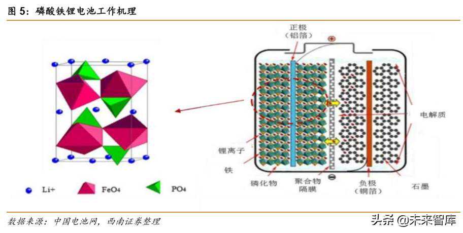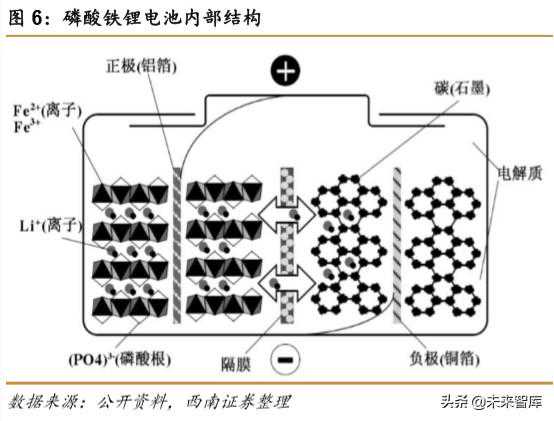 磷酸铁锂电池正极由橄榄石结构的LiFePO4组成,负极由石墨组成,中间是聚烯烃PP/PE/PP隔膜,用于隔离正负极、阻止电子而允许锂离子通过。在充放电的过程中,磷酸铁锂电池正极的离子、电子得失如下: