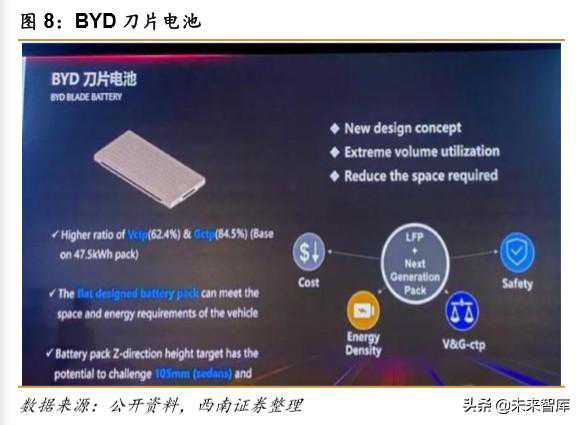 2宁德时代和比亚迪引领CTP方案,进一步降低成本比亚迪董事长王传福先生在参加电动车百人会时透露,比亚迪已研发出新一代磷酸铁锂电池“刀片电池”,这款电池预计今年量产,“刀片电池”在体积比能量密度上比传统铁电池提升了50%,具有高安全、长寿命等特点,整车寿命可达百万公里以上,能量密度可达180Wh/kg,相比此前提升大约9%,这一数据已经不弱于NCM811的三元锂电池,并且能够解决磷酸铁锂电池能量密度低的短板问题。这款电池将搭载在新车比亚迪“汉”上,预计于今年6月上市。